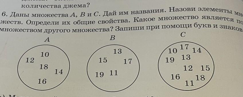 Даны множества А, B и C. Дай им назвавания . Назови элементы множеств. Определи их общие свойства . Какое множество является подмножеством другого множество? Запиши при помощи букы и знаков.