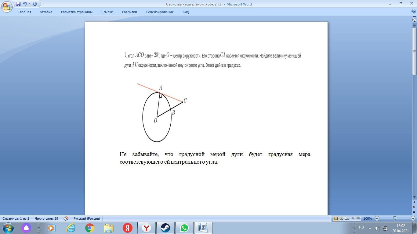 угол АСО равен 28°, где 0-центр окружности. его сторона СА касается окружности. найдите величину меньшей дуги. АВ окружности, заключенной внутри этого угла. ответ дайте в градусах.