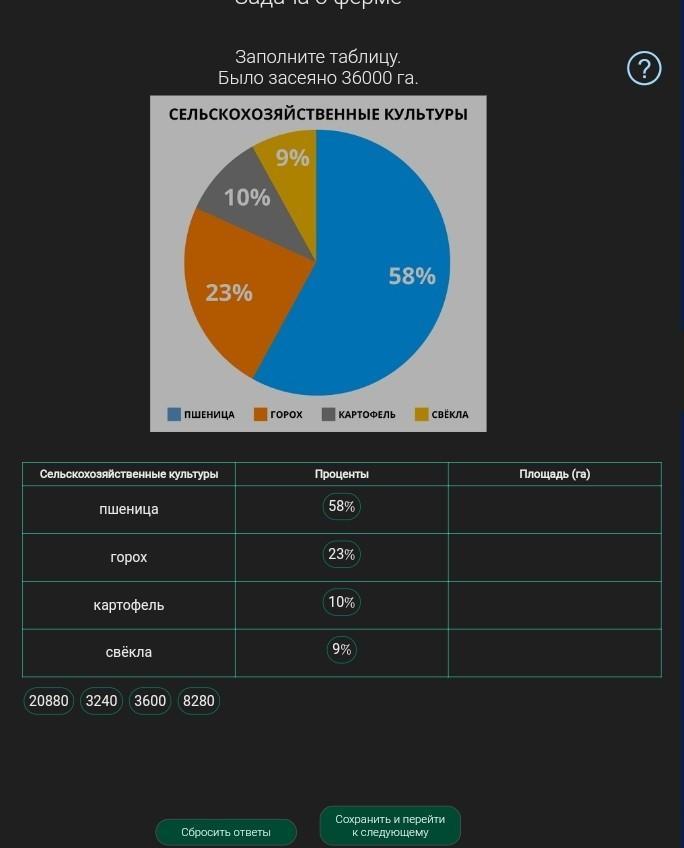 58% это 20880 23% это 8280 10% это 3600 9% это 3240