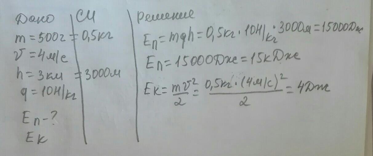 Снаряд массой 500 г движется со скоростью 4 м/с на высоте 3 км. Вычислите