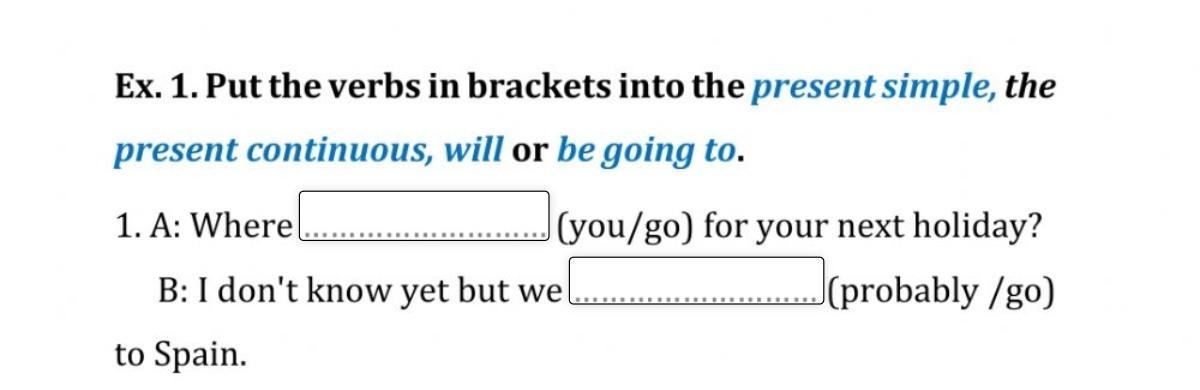 Срочно!! Put the verbs in brackets into the present simple, tha present continous l, will or be going to.
