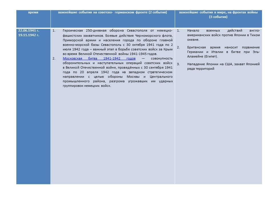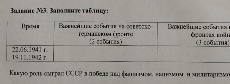 Задание №3. заполните таблицу: время 22.06.1941 г. 19.11.1942 г. важнейшие события на советско- германском фронте (2 события) важнейшие события в мире, на фронтах войны (3 события) какую роль сыграл ссср в победе над фашизмом, нацизмом и милитаризмом?
