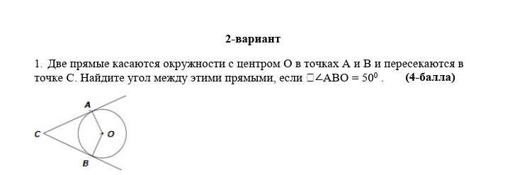 Две прямые касаются окружности с центром О в точках A и B и пересекаются в точке С. Найдите угол между этими прямыми, если <AB0=50°.