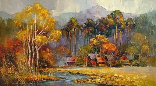 Які види дерев (які знаходяться серед хат) змальовані на картини Ф. Манайла "Золота осінь"?