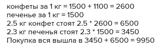 купили 2,5 кг конфет и 2,3 печени. Сколько стоила покупка, если 1кг печени стоит 5500,сумов, а конфека 3200 сумов дороже? Пж помогите пожалуйста