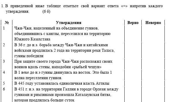 1. В приведенной ниже таблице отметьте свой вариант ответа утверждения (66) No 1 Утверждения Чжи-Чжи, нацеленный на объединение гуннов, объединившись с канглы, переселился на территорию Южного Казахстана В 36 г. до н. э. борьба между Чжи-Чжи и китайскими войсками продлилась 2 года на территории реки Таласа, гунны победили При защите своего города Чжи- Чжи расположил своих ль стены, наподобии «рыбьей чешуи» В 1 веке до н.э ГУННЫ Двинулись на восток. Это была 1 воинов волна переселения гуннов в 445 году установилась единоличная власть Аттилы В 451 г. н. э. на территории Галлии в городе Орлеан между гуннами и римлянами произошла Каталаунская битва, которая продлилась больше суток «+» напротив каждого 4(+ 3) Верно Неверно + into