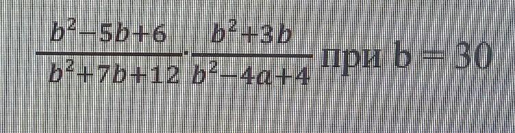 Числитель первой дроби раскладывается на множители (b-3)(b-2), а числитель второй дроби b(b+3). Знаменатель первой дроби раскладывается на множители (b+3)(b+4), знаменатель второй дроби раскладывается на множители (b-2)^2. Итого сокращая у нас будет b(b-3)/((b+4)(b-2) => (30*(30-3))/((30+4)(30-2)) => (30*27)/(34*28) = 405/476