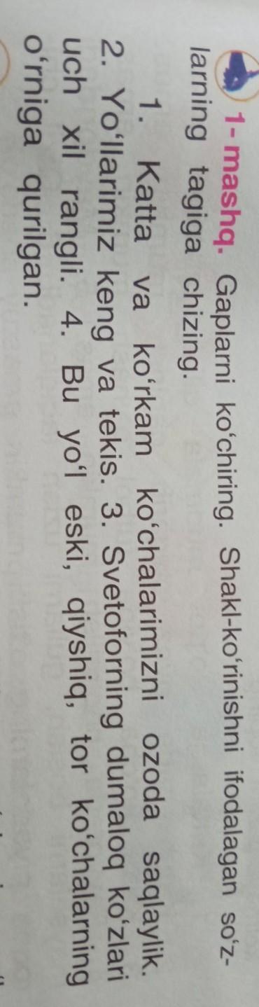 1-mashq. Gaplarni ko'chiring. Shakl-ko'rinishni ifodalagan so'z