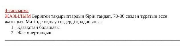 Берілген тақырыптардың бірін таңдап , 70-80 сөзден тұратын эссе жазыңыз . Мәтінде оқшау сөздерді қолданыңыз . 1.Қазақстан болашағы