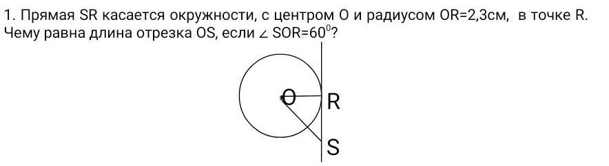 1. Прямая SR касается окружности, с центром О и радиусом ОR=2,3см, в точке R. Чему равна длина отрезка ОS, если угол SОR=?