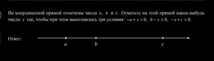 на координатной прямой отмечены числа a, b и c . отметьте на этой прямой какое-нибудь число x так, чтобы при этом выполнялись три условия: -а+х>0 ; б-х>0; -х+с>0.