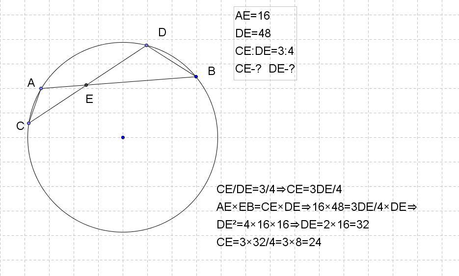 Хорды АВ и CD пересекаются в точке E. Найдите CE и DE, если AE = 16 см, BE = 48 см и CE : DE = 3/4.