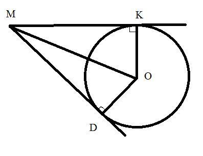 Касательные, проведённые из одной точки к окружности, равны. Радиус, проведённый в точку касания, перпендикулярен касательной. Треугольники △OKM и △ODM равны, например, по катету (OK=OD как радиусы) и общей гипотенузе ОМ. => <OMK=<OMD