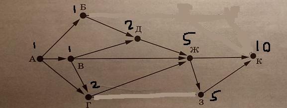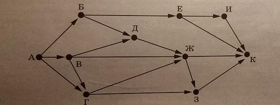 Решите пожалуйста задачу. На рисунке - схема дорог, связывающих города A, Б, В, Г, Д, Е, Ж, З, И и К. По каждой дороге можно двигаться только в одном направлении, указанном стрелкой. Сколько существует различных путей из города A в город K, проходящих через город Ж.Отдам 10 баллов.........