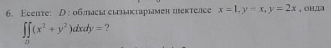 Пожалуйста, помогите! Нужно решить зачаду. Если область D ограничена прямыми x = 1, y = x, y = 2x, то двойное дифференциальное уравнение?