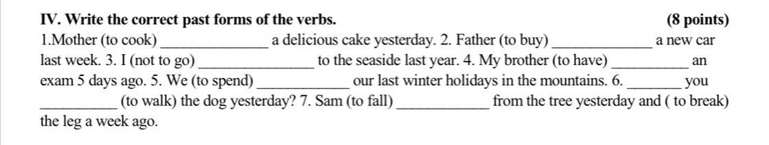 1. cooked 2. bought 3. didn't go 4. had 5. spent 6. do you walked 7. fell, broke