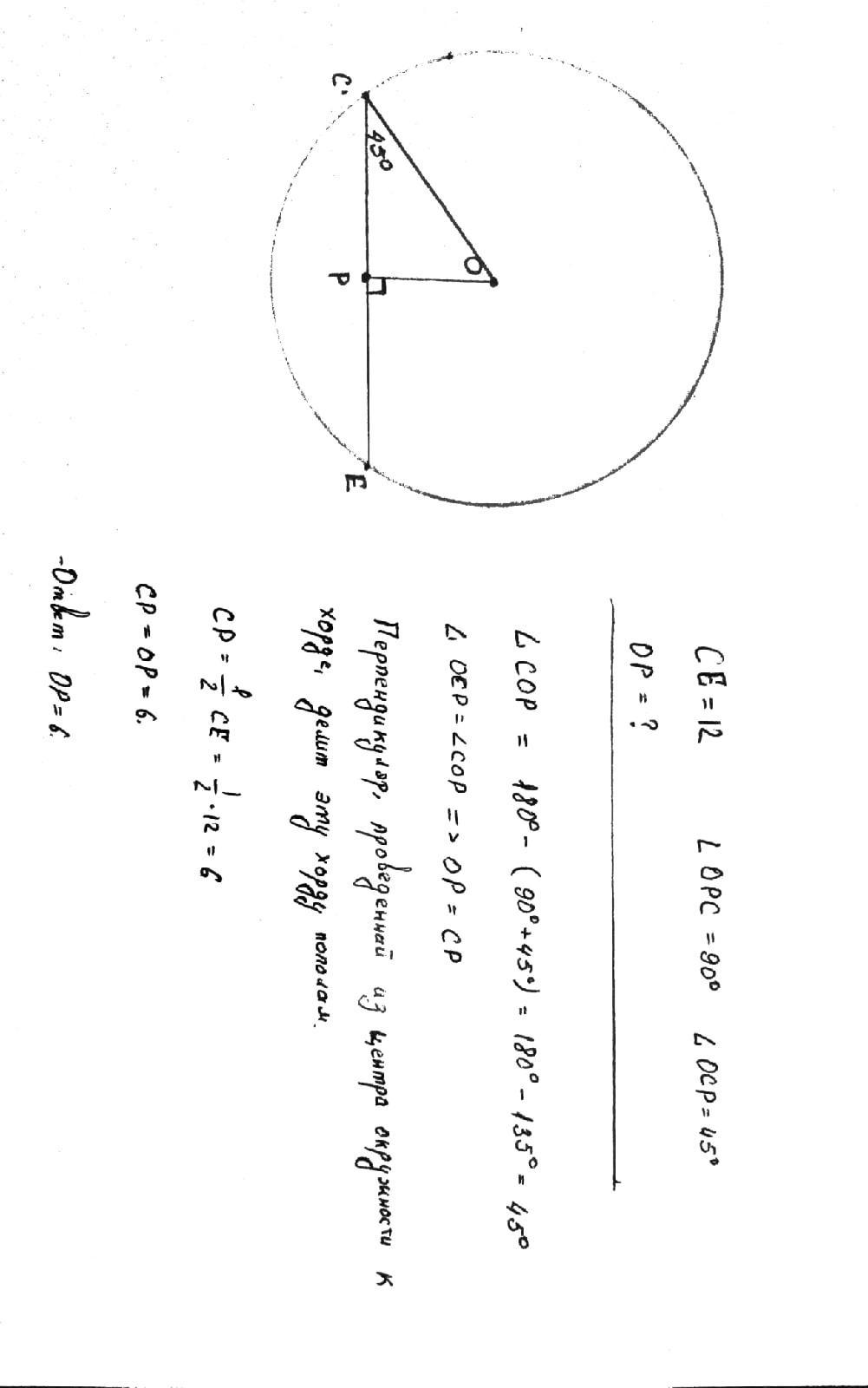 Из цпнтра О окружности к хорде СЕ, равной 12см, проведен перпендикуляр ОР. Найдите длину перпендикуляра, если градиусная мера угла ОСР равно 45 градусам.
