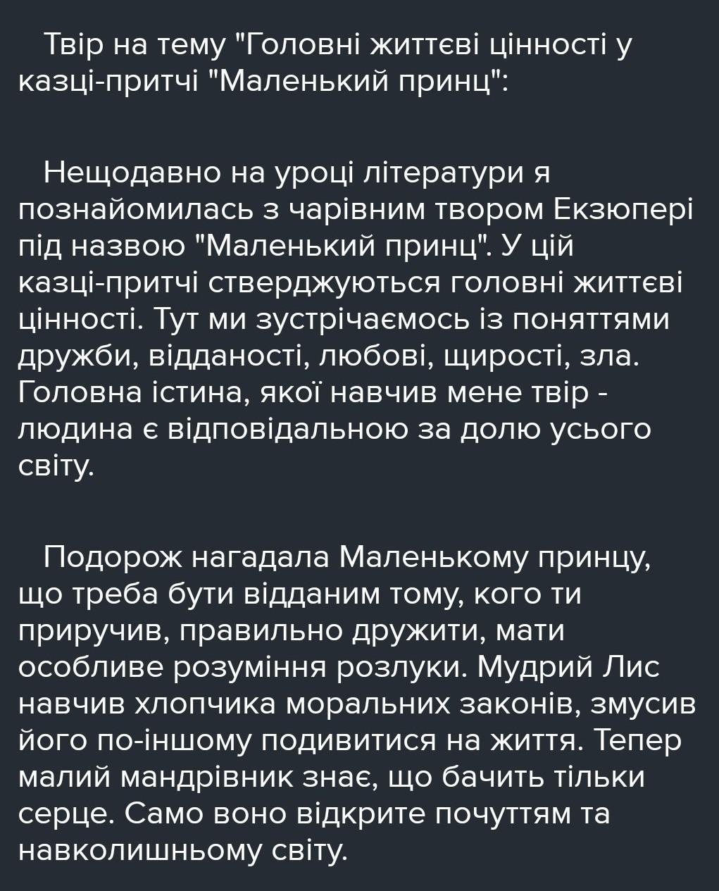 Написати твір за мотивами філософської казки Екзюпері «Маленький принц» за темою: «Розуміння героями головних життєвих цінностей».