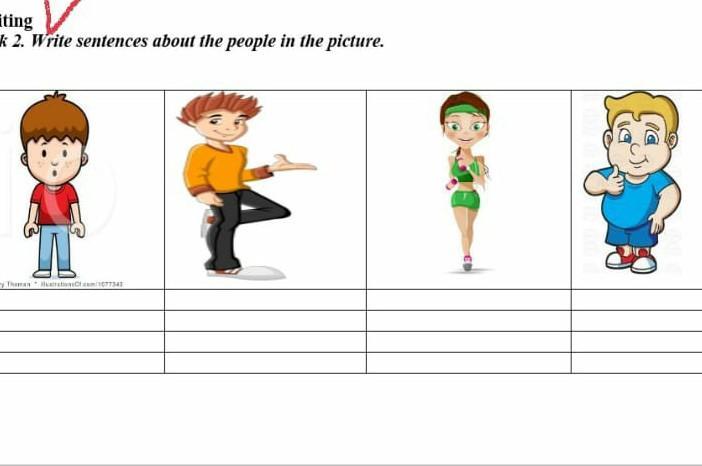 1.This boy wear red t-shirt and blue jeans.He has got dark hear.2.This boy wear orange bluse and black trousers.He has got orange hear.3.This girl has got dark hair.She wear sports suit.4 This boy has got fair hair.He wear blue t-shirt and blue shorts.He has got blue eyes