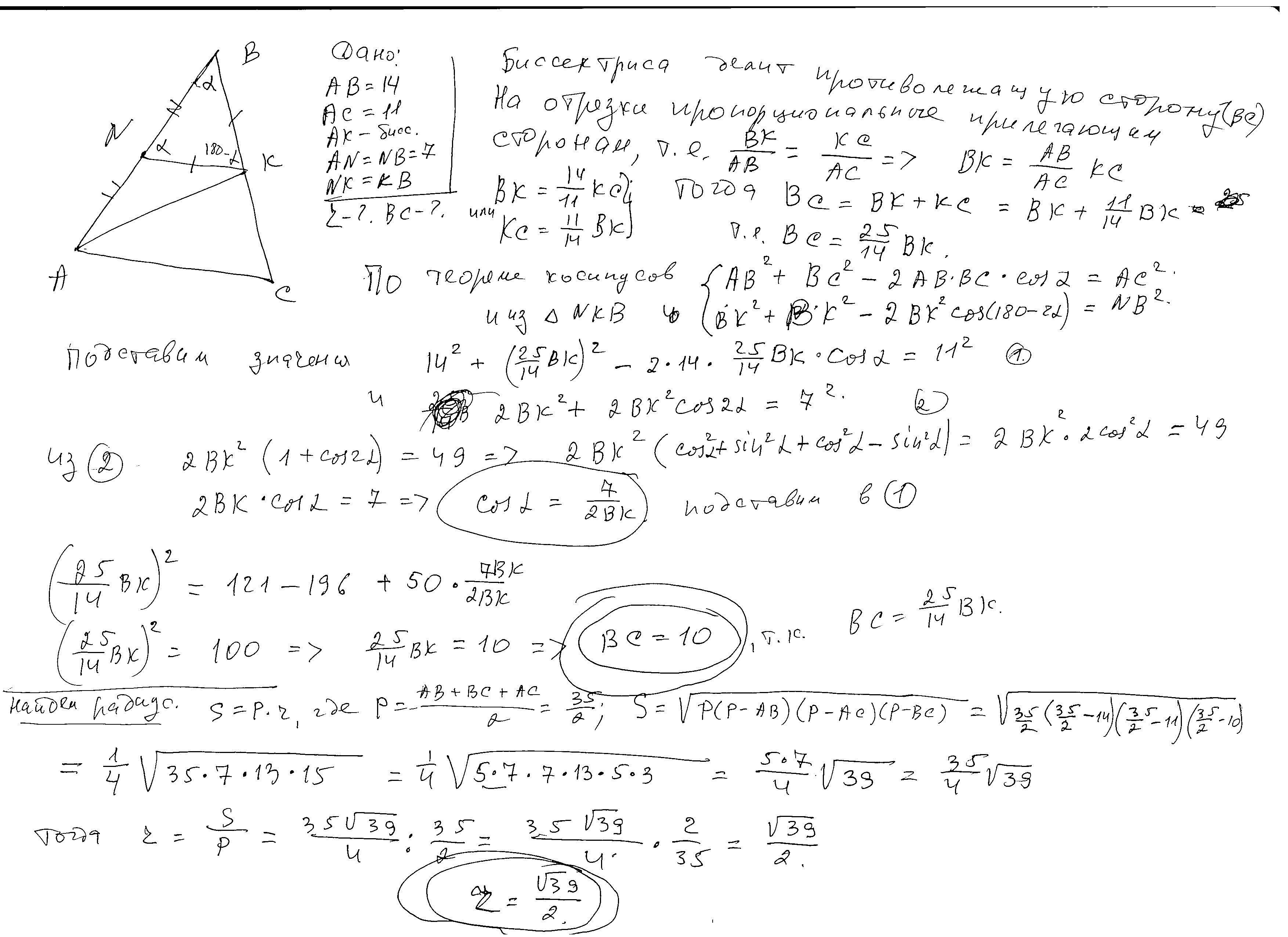 Найдите длину стороны BC и радиус вписанной в треугольник ABC окружности, если известно, что AC=11, AB=14.