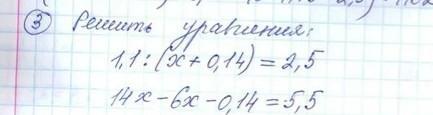 1.1 \div (x + 0.14) = 2.5 \\   \frac{1.1}{x + 0.14}  = 2.5 \\ 2.5(x + 0.14) = 1.1 \\ 2.5x + 0.35 = 1.1 \\ 2.5x = 1.1 - 0.35 \\ 2.5x = 0.75 \\ x = 0.75 \div 2.5 \\ x = 0.3