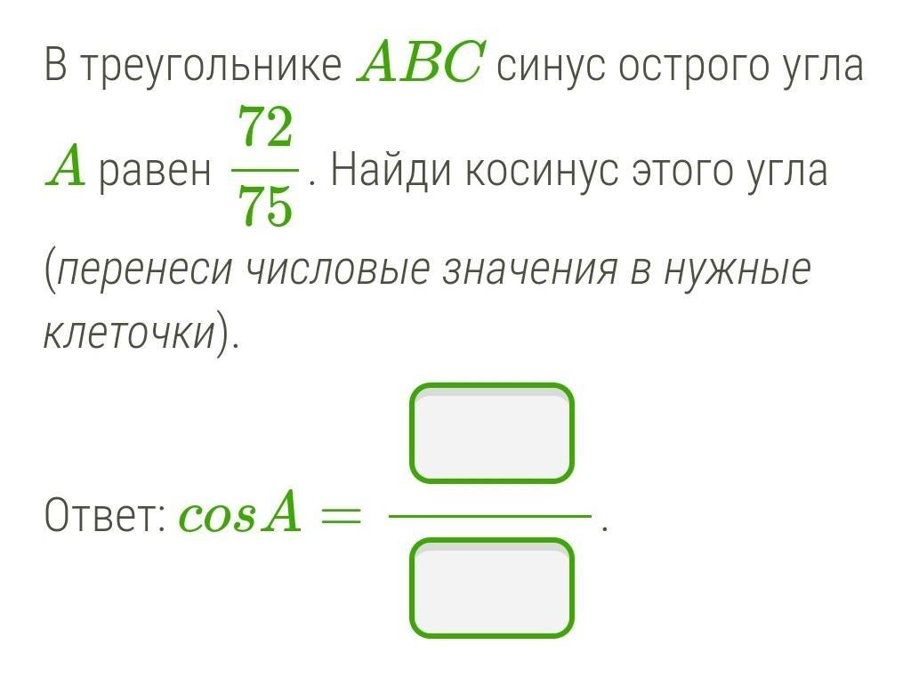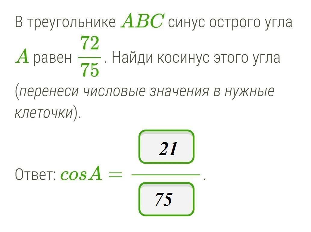 cosA=√1-(72/75)²=√1-5 184/5 625 = √441/5625=21/75.