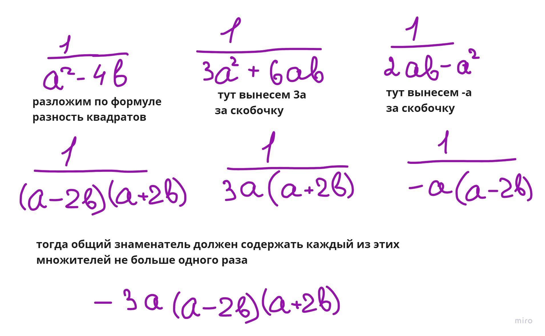 3) 1/(a² - 4b²), 1/(3a² ^ 2 + 6ab) и 1/(2ab - a ²) с решением пожалуйста: задание привести дроби к общему знаменателю