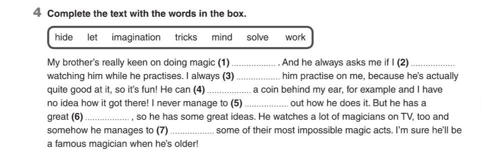 Ответ: 1 tricks 2.mind 3. let 4. hide 5. work 6. imagination 7. solve