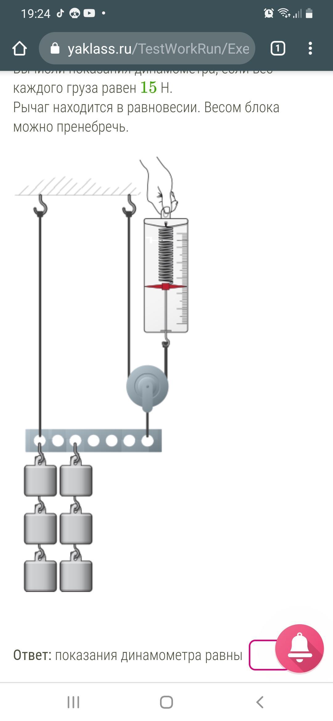 Помогите срочно 1 задание: Вычисли показания динамометра, если вес каждого груза равен 15 Н.