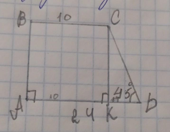 ABCD- прямокутна трапеція BC=10см AD=24см кут D=45°