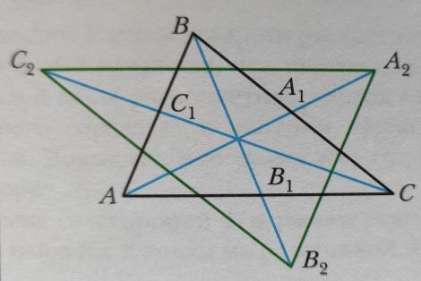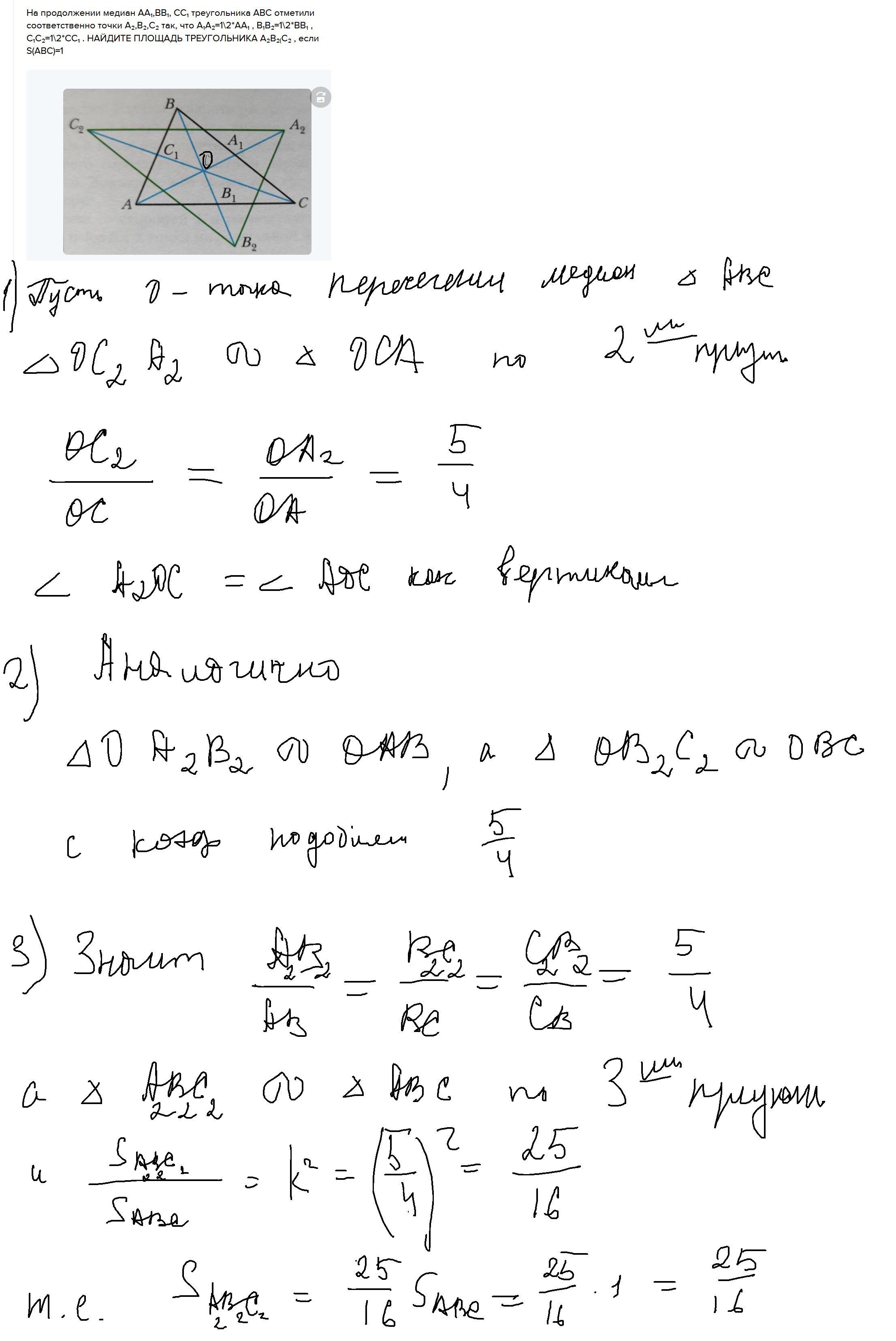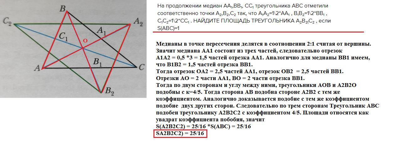 На продолжении медиан АА₁,ВВ₁, СС₁ треугольника АВС отметили соответственно точки А₂,В₂,С₂ так, что А₁А₂=1\2*АА₁ , В₁В₂=1\2*ВВ₁ , С₁С₂=1\2*СС₁ . НАЙДИТЕ ПЛОЩАДЬ ТРЕУГОЛЬНИКА А₂В₂₍С₂ , если S(АВС)=1