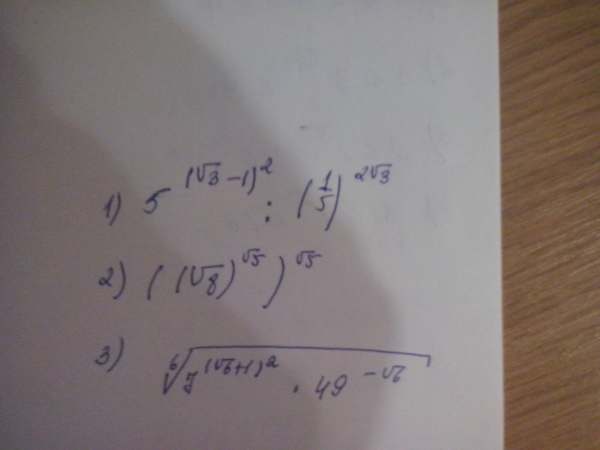 5^{( sqrt{3}-1 )^{2}}:(1/5)^{2 sqrt{3} }=5^{2-2 sqrt{3} }*5^{2 sqrt{3} }=5^2=25