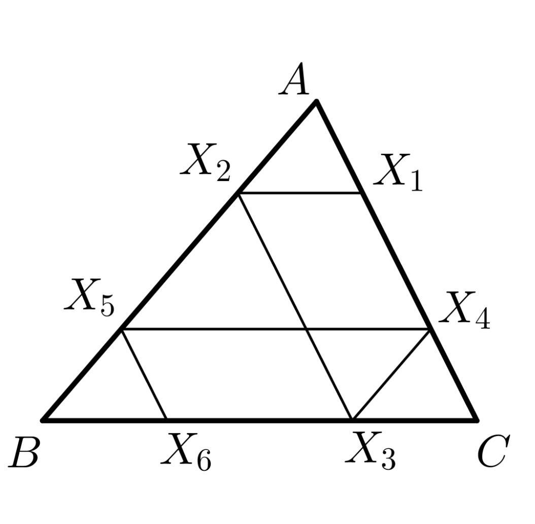 Объяснение: долго расписывать основная мысль такая по теореме фалеса говоришь что AХ1/АХ2=2/3 потом пусть X2X5=2y X1X4=3X далее по аналогии находишь BX5 и с BX6 по фалеса и находишь CX4 CX3 конкретных чисел не помню но BX5=что-то умножить на y и также с BX6 CX4 CX3(эта штука равна чему-то умножить на y вроде) считаешь углы у параллелограммов которые прям очевидно бросаются в глаза на рисунке дальше говоришь что треугольники AX2X1 И BX5X6 равны ну там поймёшь о чем я посчитав углы, а дальше у тебя будет известны две стороны на BC и X3X6 легко найдётся. Буду рад если кто-то понял о чем я и напишет более подробное решение.