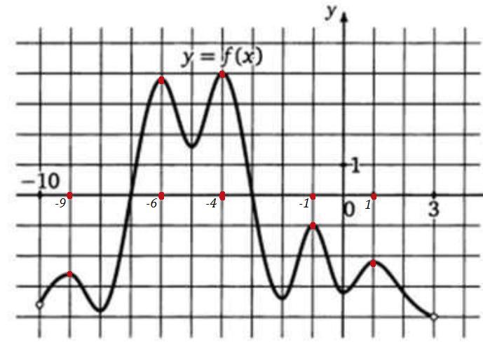 Визначити кількість точок максимуму функції y=f(x) визначеної на проміжку (-10; 3), графік якої зображений на рисунку: