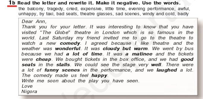 1б Прочтите письмо и перепишите его. Сделайте это отрицательным. Используйте слова. балкон, трагедия, плакал, дорого, мало времени, вечернее представление, ужасно, несчастно, на такси, плохие сиденья, театральные очки, грустные сцены, ветрено и холодно, плохо