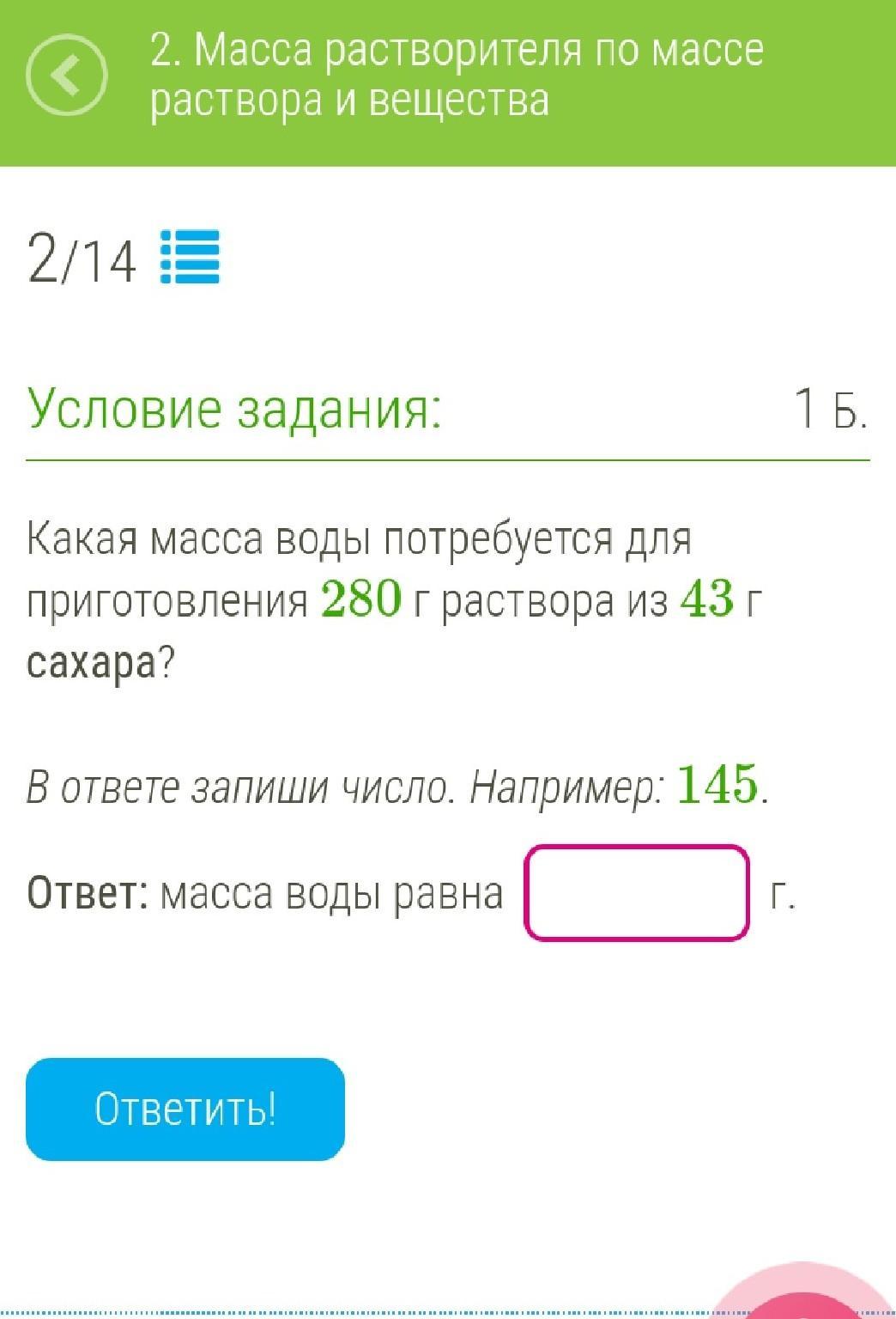 Какая масса воды потребуется для приготовления 280 г раствора из 43 г сахара?
