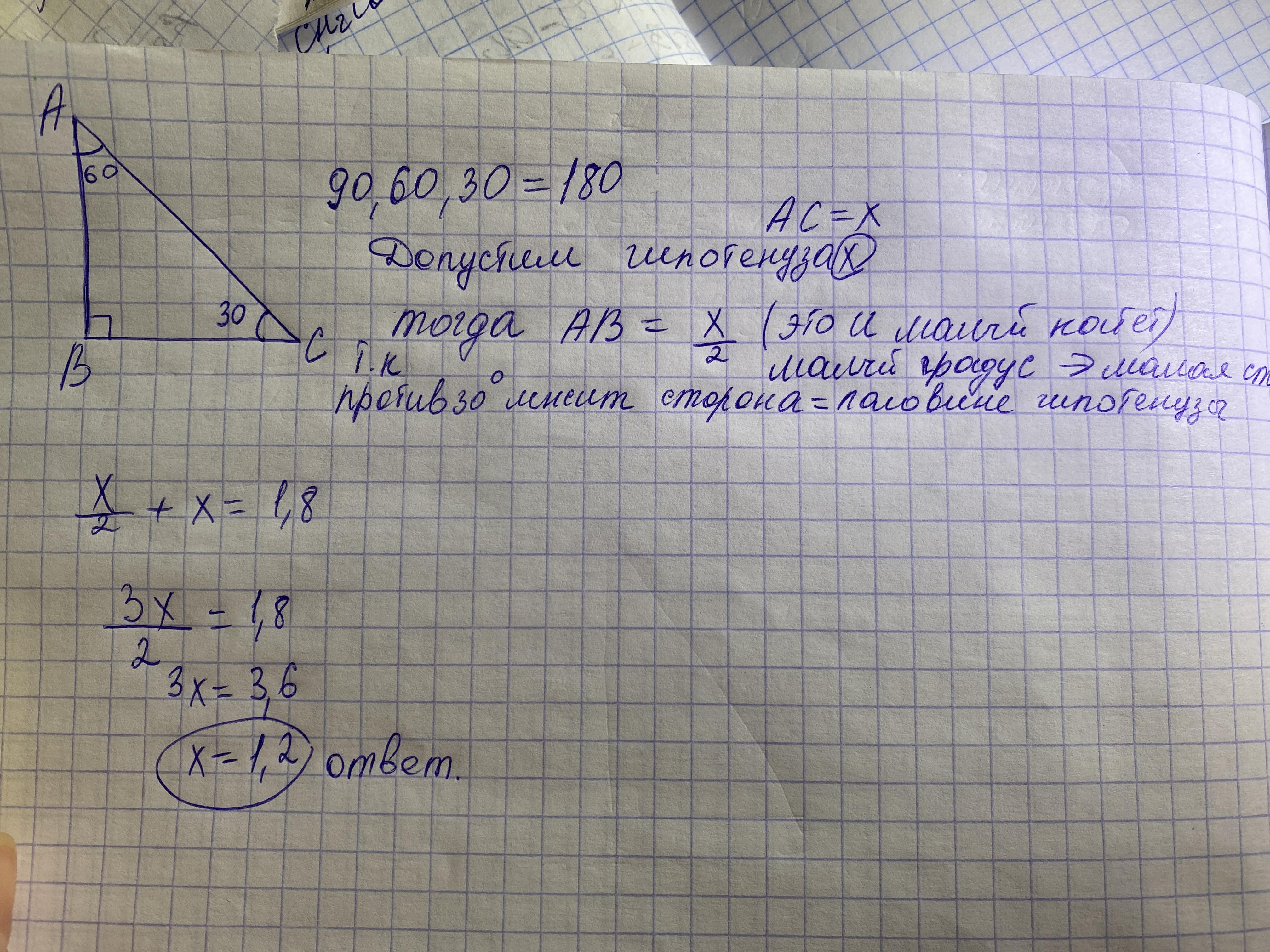 Один острый угол прямоугольного треугольника равен. Сумма длин малой и гипотенузы составляет 1,8 см. Необходимо найти гипотенузу.