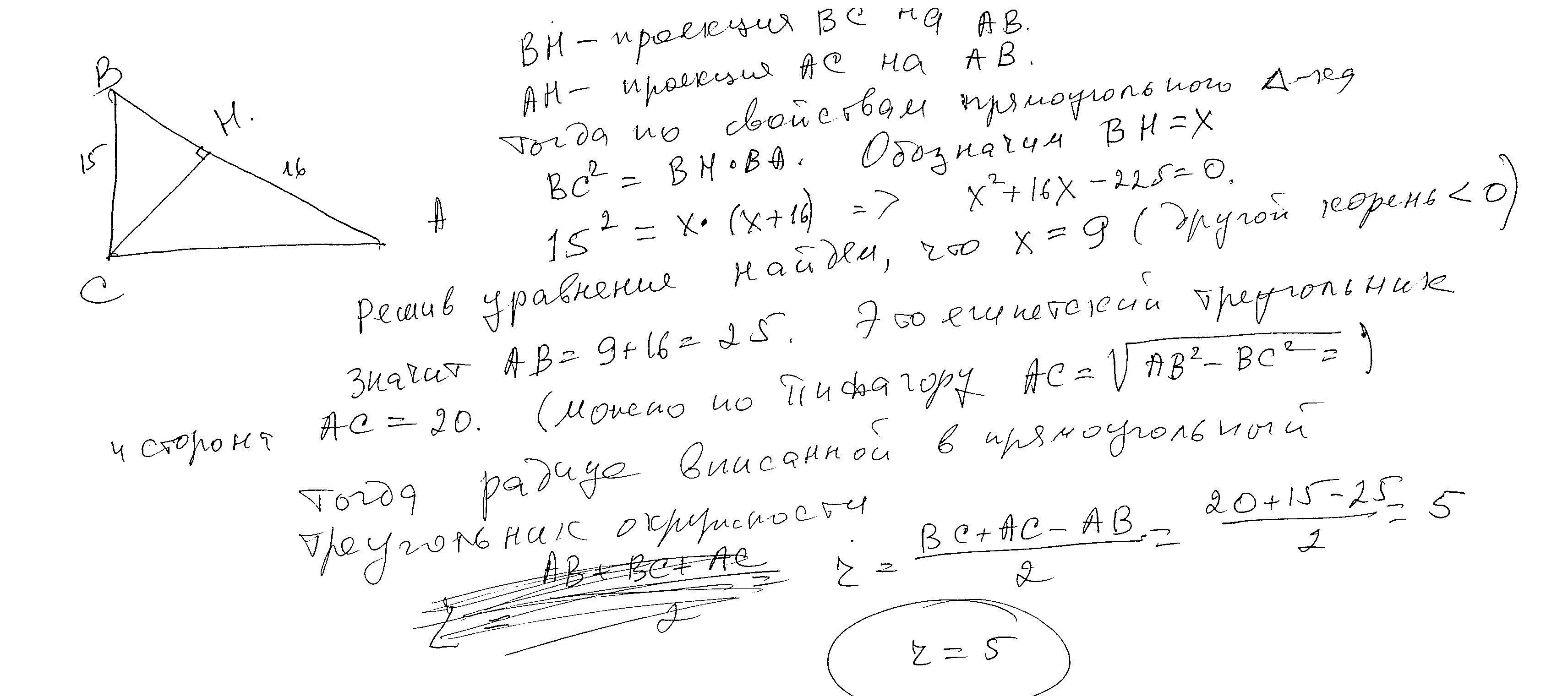 Квадрат катета равен произведению гипотенузы на проекцию этого катета на гипотенузу. Если проекцию катета в 15 см обозначить через х, то 15²=х*(х+16); х²+16х-225=0, по Виету х=-25 / не подходит, т.к. не может быть отрицательным проекция катета/, х=9, значит, гипотенуза равна 9+16=25, второй катет равен√(25²-15²)=√(10*40)=20, площадь, с одной стороны равна а*b/2=15*20/2=150, а с другой стороны р*r, где р=(а+b+c)/2=(20+15+25)/2=30; r - искомый радиус; 30r=150⇒r=150/30=5