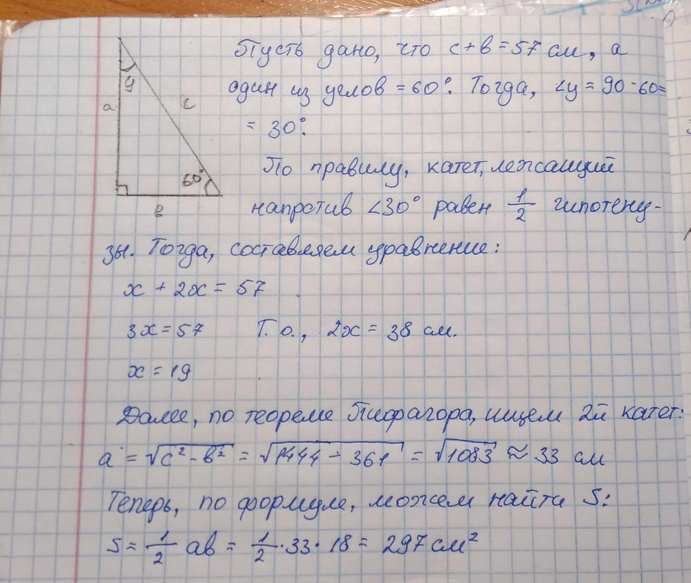 Один из углов прямоугольного треугольника 60°, сумма гипотенузы и меньшего катета равна 57 см. Найдите площадь треугольника.