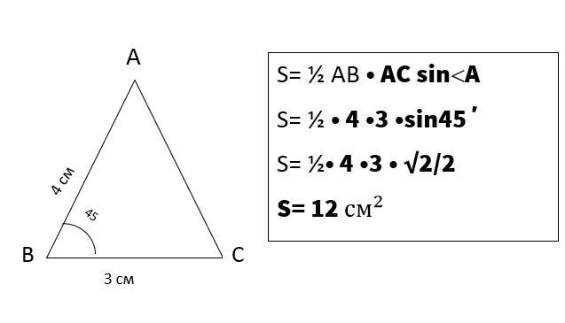 Знайдіть площу трикутника довжин двох сторін якого дорівнюють 4 см і 3 см ,кут між ними 45 градусів