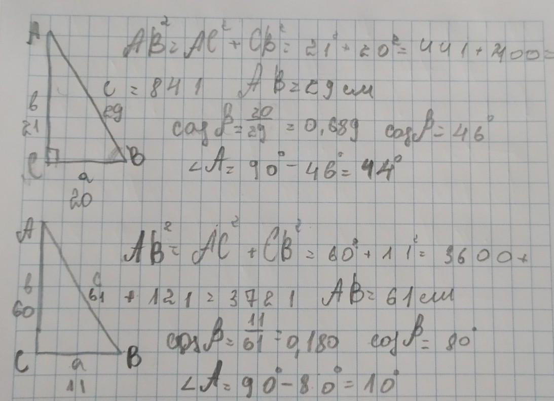 1. Обчисли невідомі сторони та гострі кути прямокутного трикутника за двома катетами: