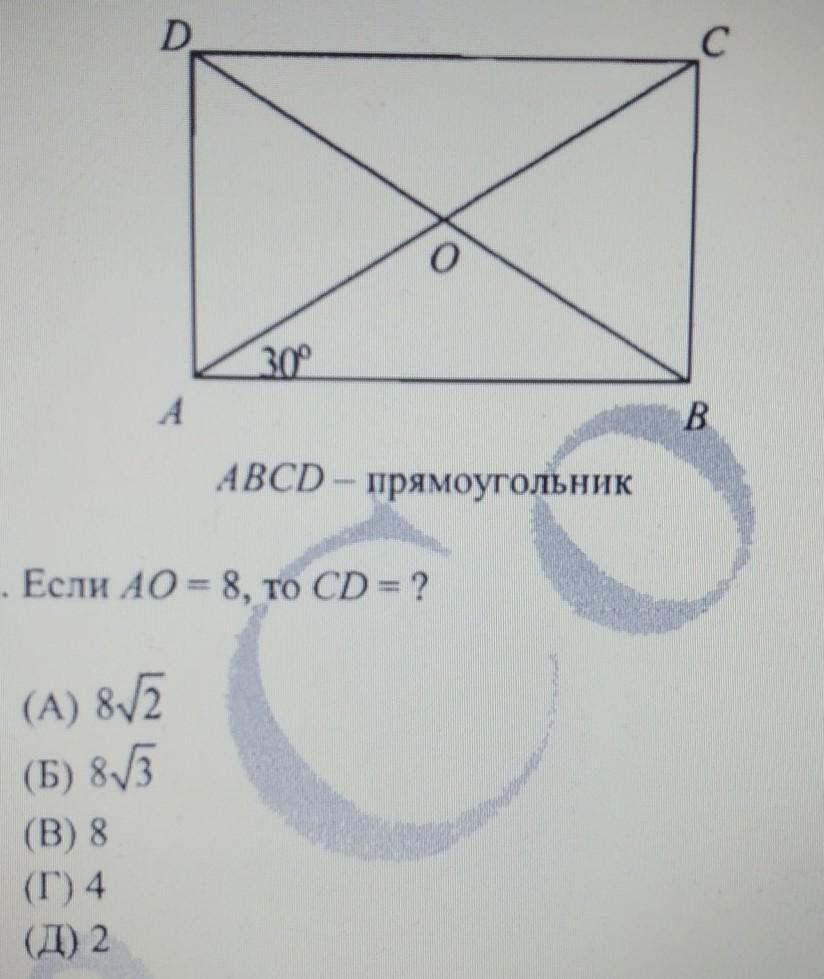 т.к. АВСD - прямоугольник, его диагонали равны и вертикальны => АВО=DOC, АО=ОВ=ОD=OC=8см