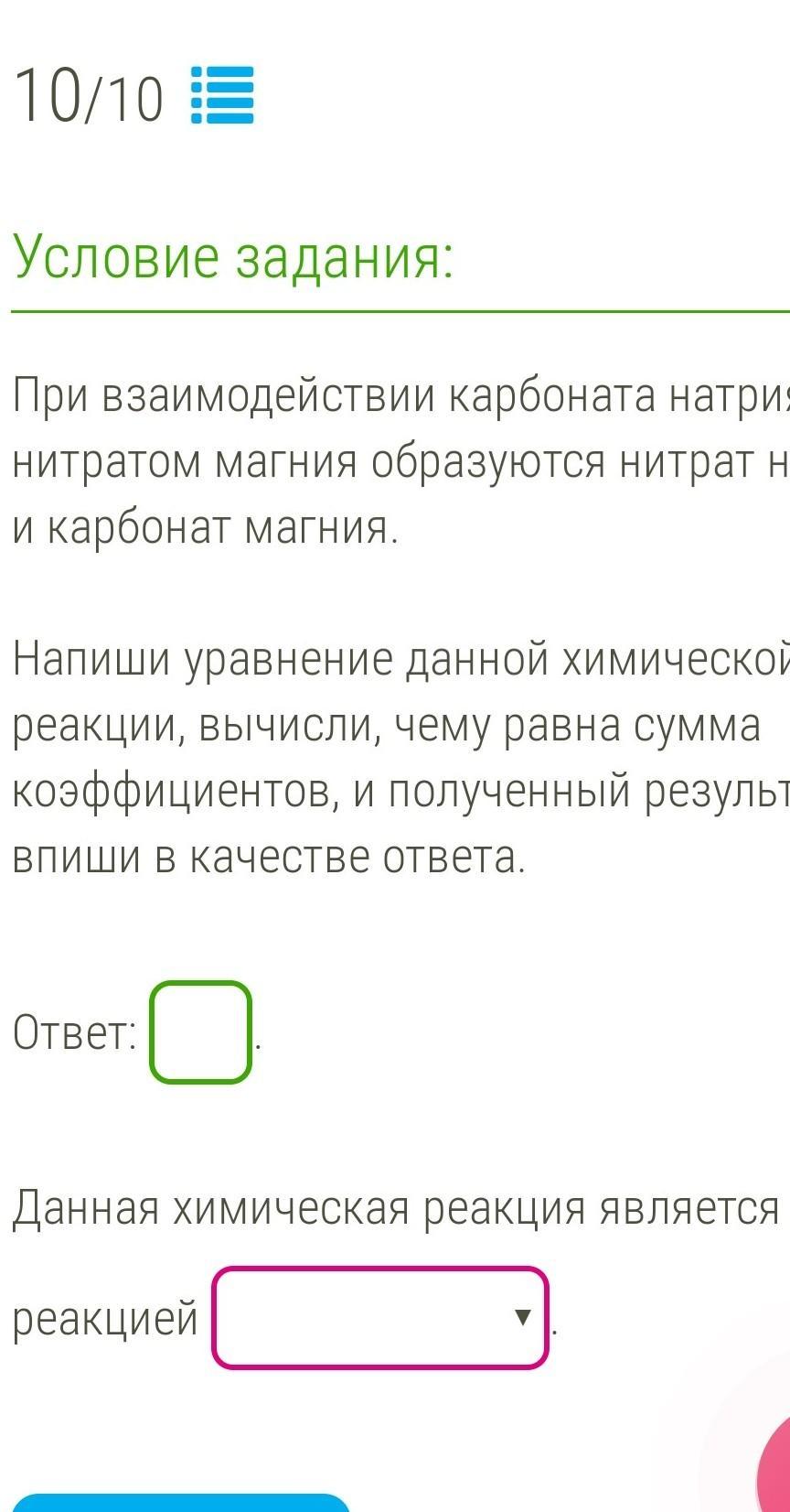 Напиши уравнение данной химической реакции, вычисли, чему равна сумма коэффициентов, и полученный результат впиши в качестве ответа.