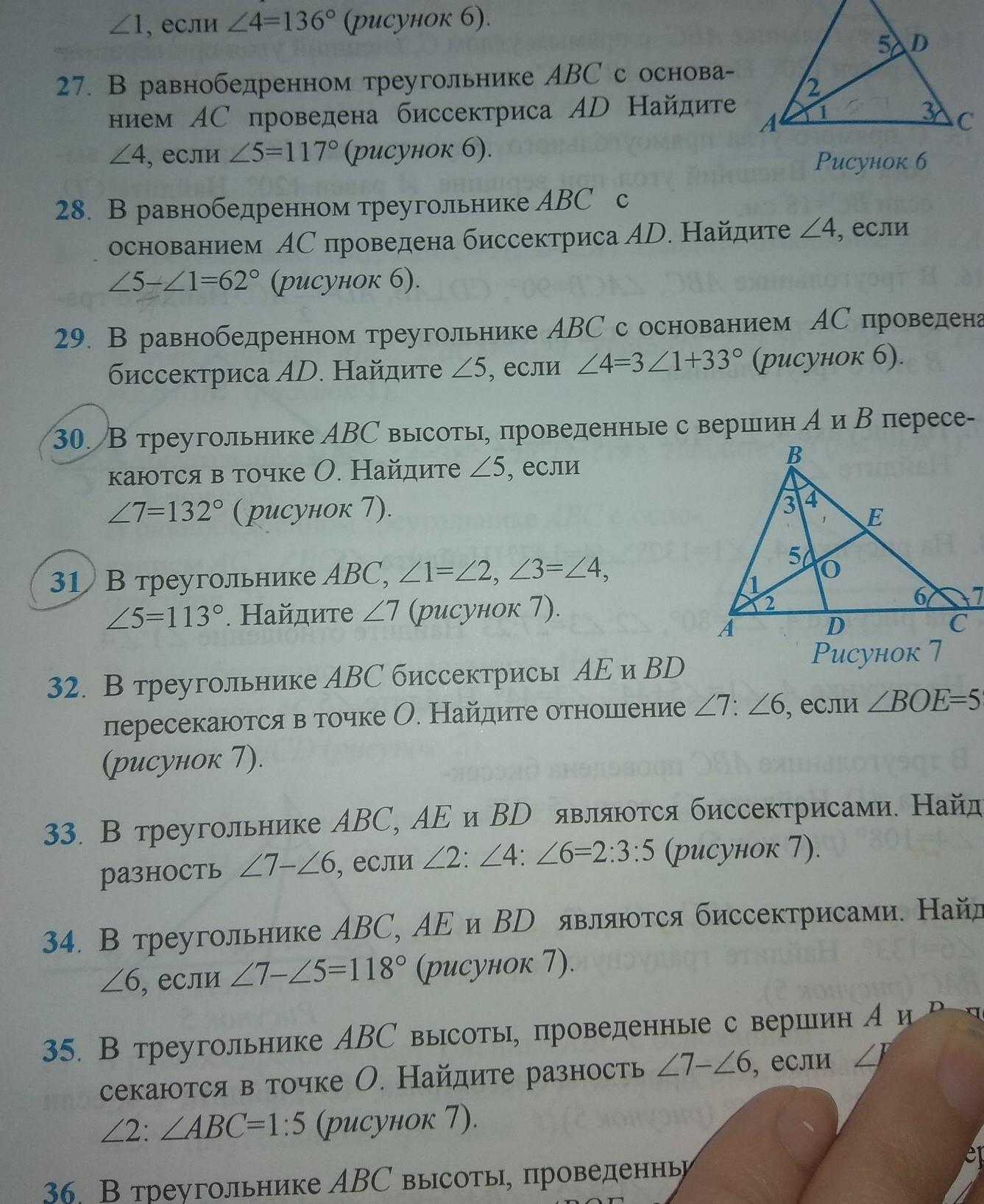 31) угол между биссектрисами равен 90+угол6/2 => угол 6 = 113*2-180=46° => угол7=180-46=134°