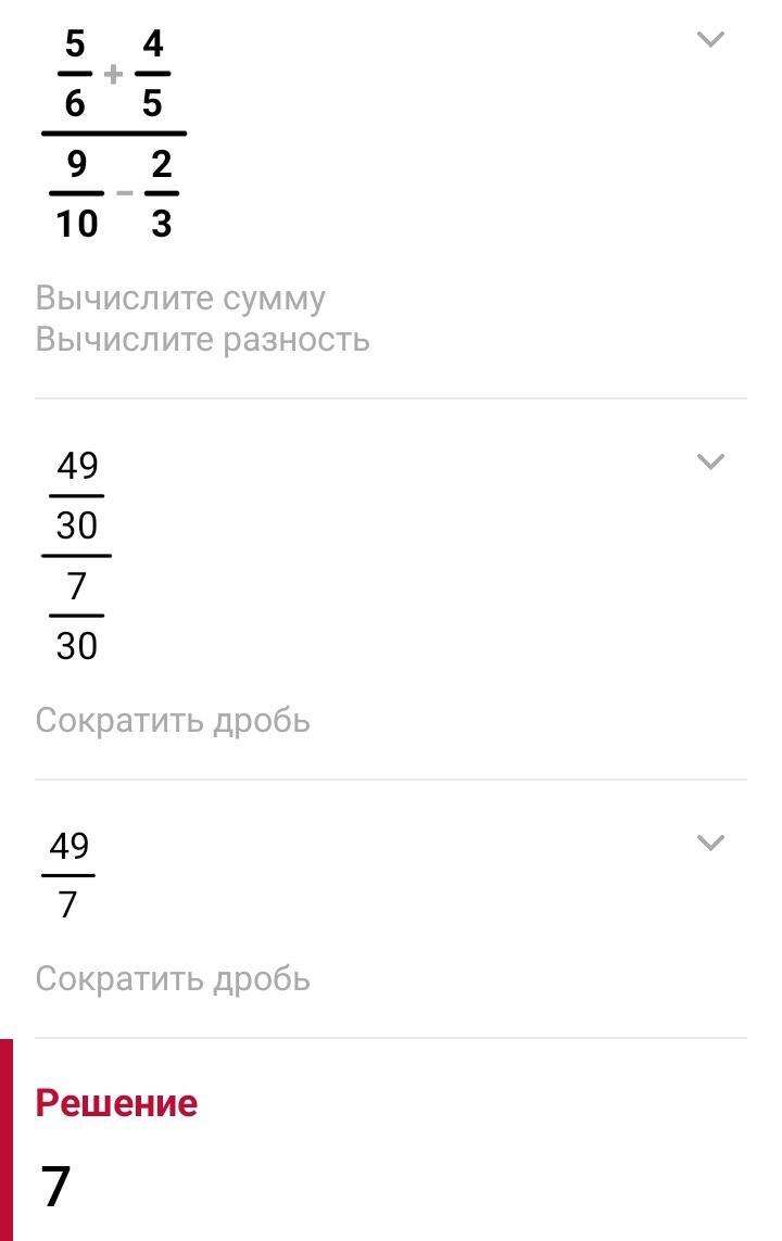 Или так: (5/6 +4/5)/(9/10 -2/8)=((25+24)/30)/(9/10 -1/4)=49/30 ·40/(36-10)=49/3 ·4/26=49/3 ·2/23=98/39=2 20/39