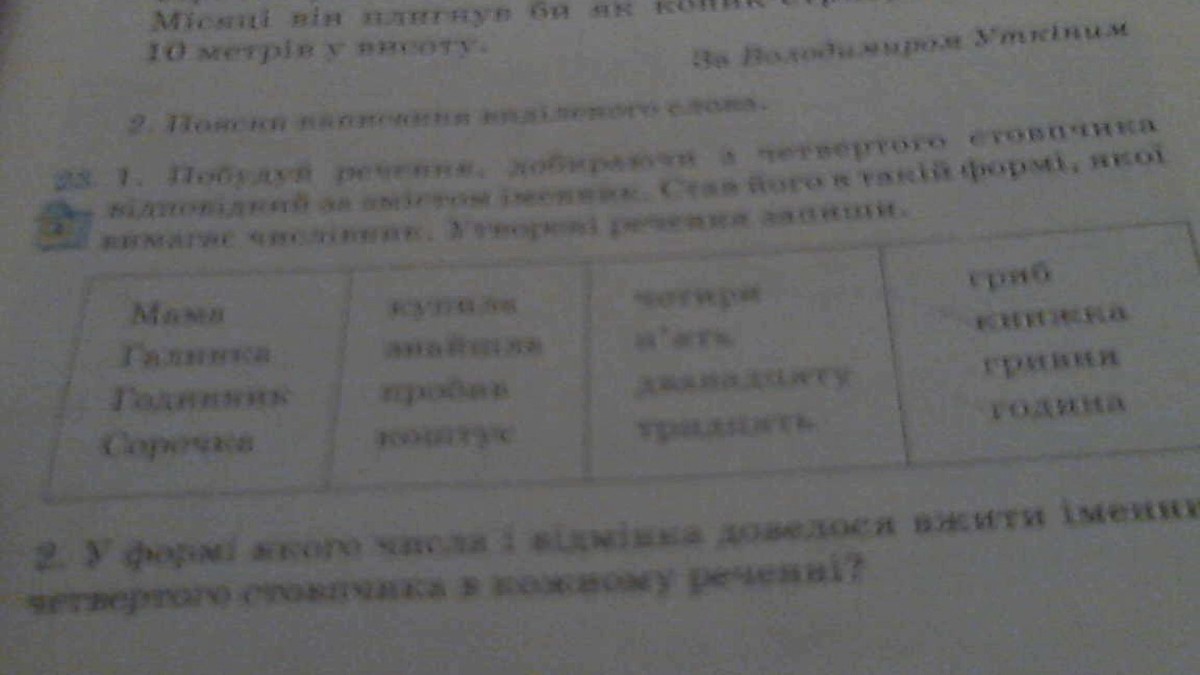 Побудуй речення,добираючи з четвертого стовпчика відповідний за змістом іменник.Став його в такій формі,якої вимагає числівник.