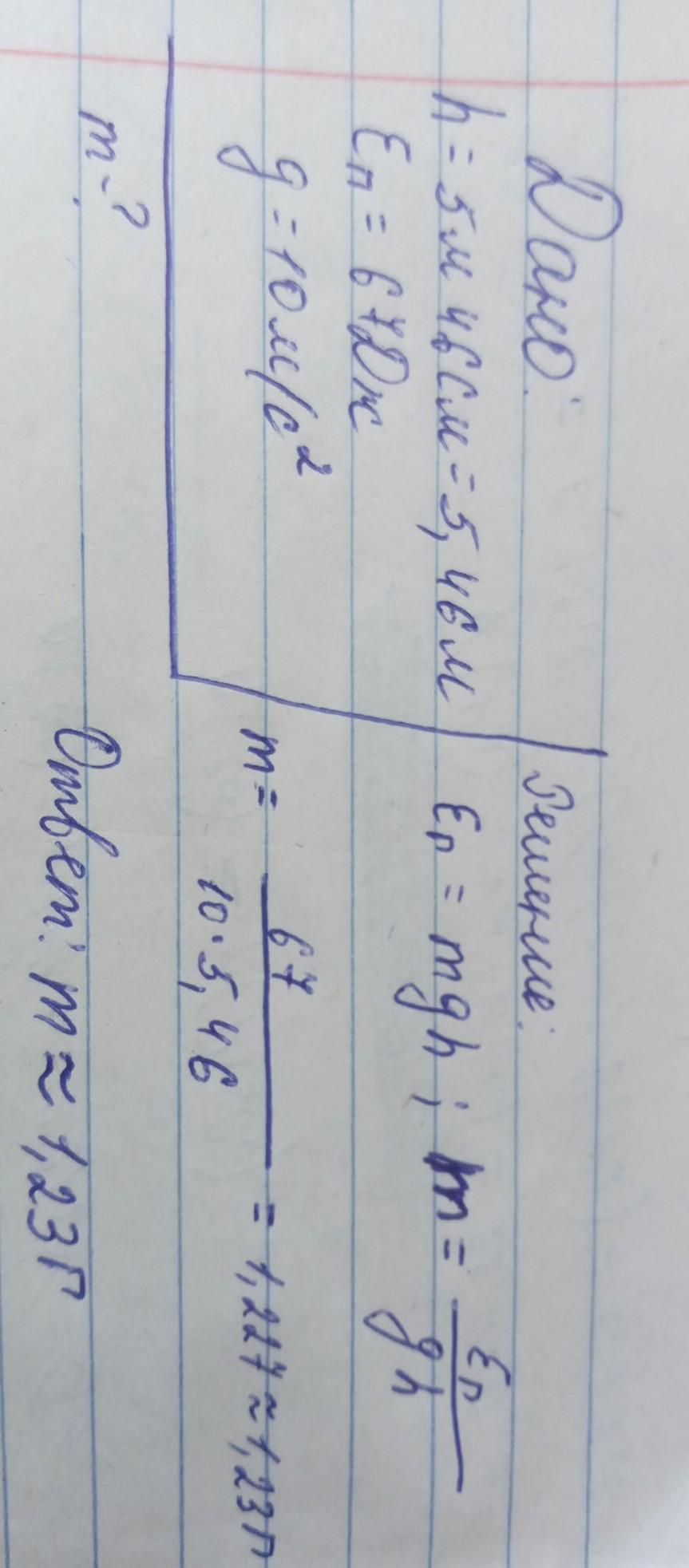 в результате броска вверх мяч поднялся на высоту 5м 46 см. На это действие была затрачена энергия в размере 67 Дж. Определите массу мяча.