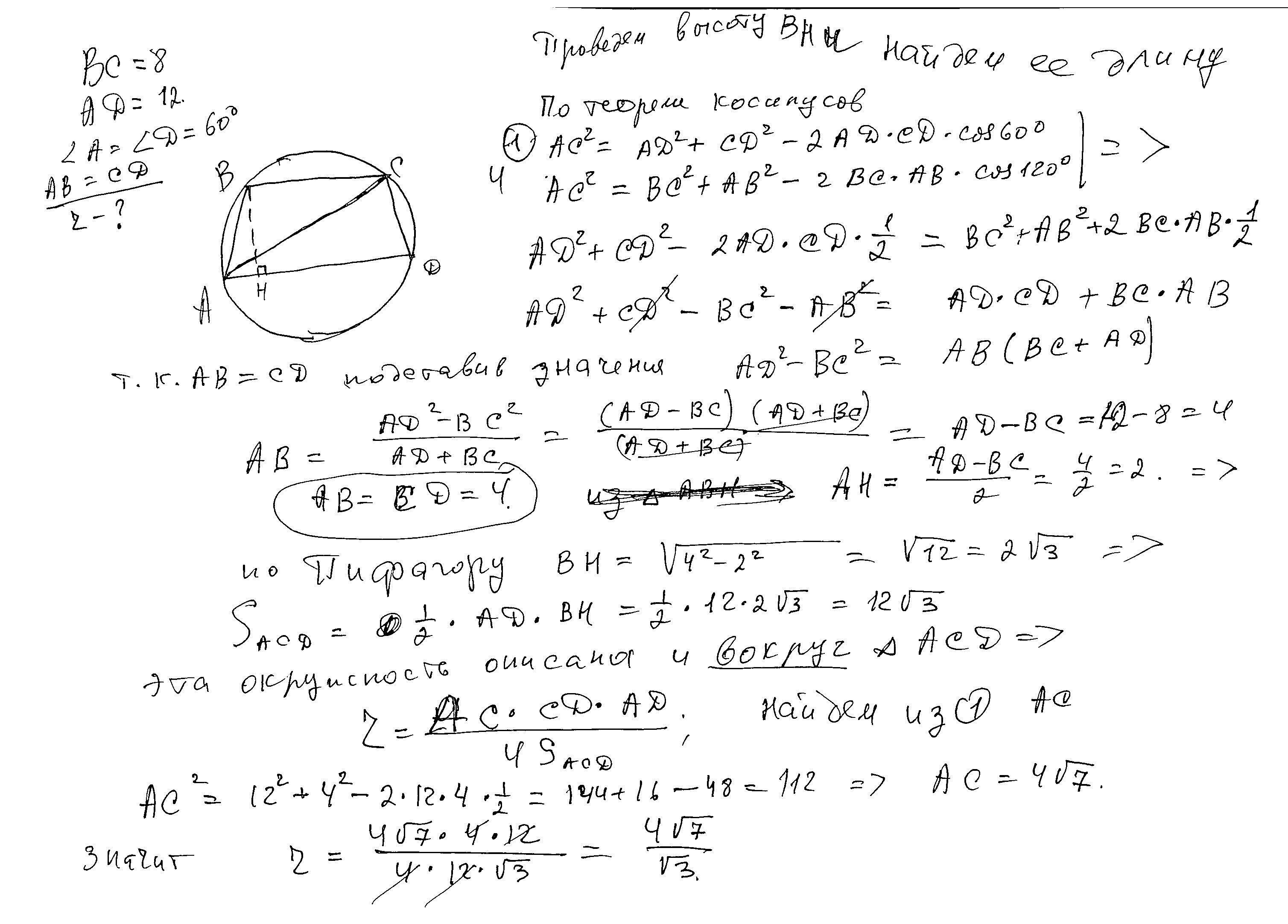 вокруг трапеции авсд с основаниями 8 и 12 описана окружность, найдите радиус этой окружности если угол а равен 60 градусов