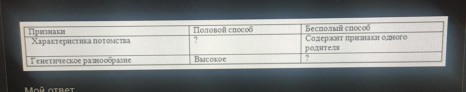 Характеристика потомства половой способ - Содержит признаки двух родителей; Генетическое разнообразие бесполый способ - низкое