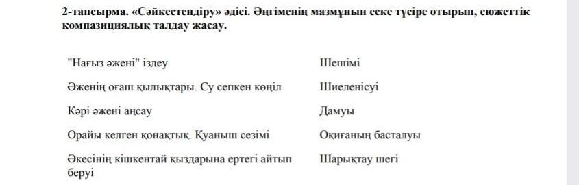 2-тапсырма Сәйкестендіру әдісі.Әнгіменің мазмұнын еске түсіре отырып сюжеттік композициялық талдау жасау
